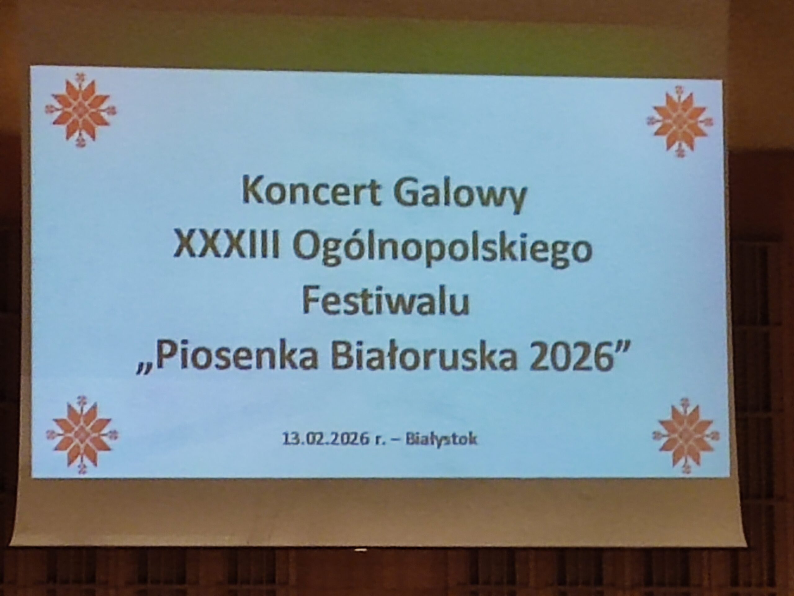W dniu 13 lutego 2026 w Białymstoku odbył się Koncert Galowy XXXIII Ogólnopolskiego Festiwalu „ Piosenka Białoruska 2026”. Przedsięwzięcie kulturalne miało miejsce w sali Filharmonii Podlaskiej. Występowały zespoły oraz soliści, którzy zwyciężyli w eliminacjach powiatowych Festiwalu. W Koncercie Galowym wzięło udział ponad 200 wykonawców. Dodatkową atrakcją były występy zespołu tanecznego „Podlaski Wianok”.