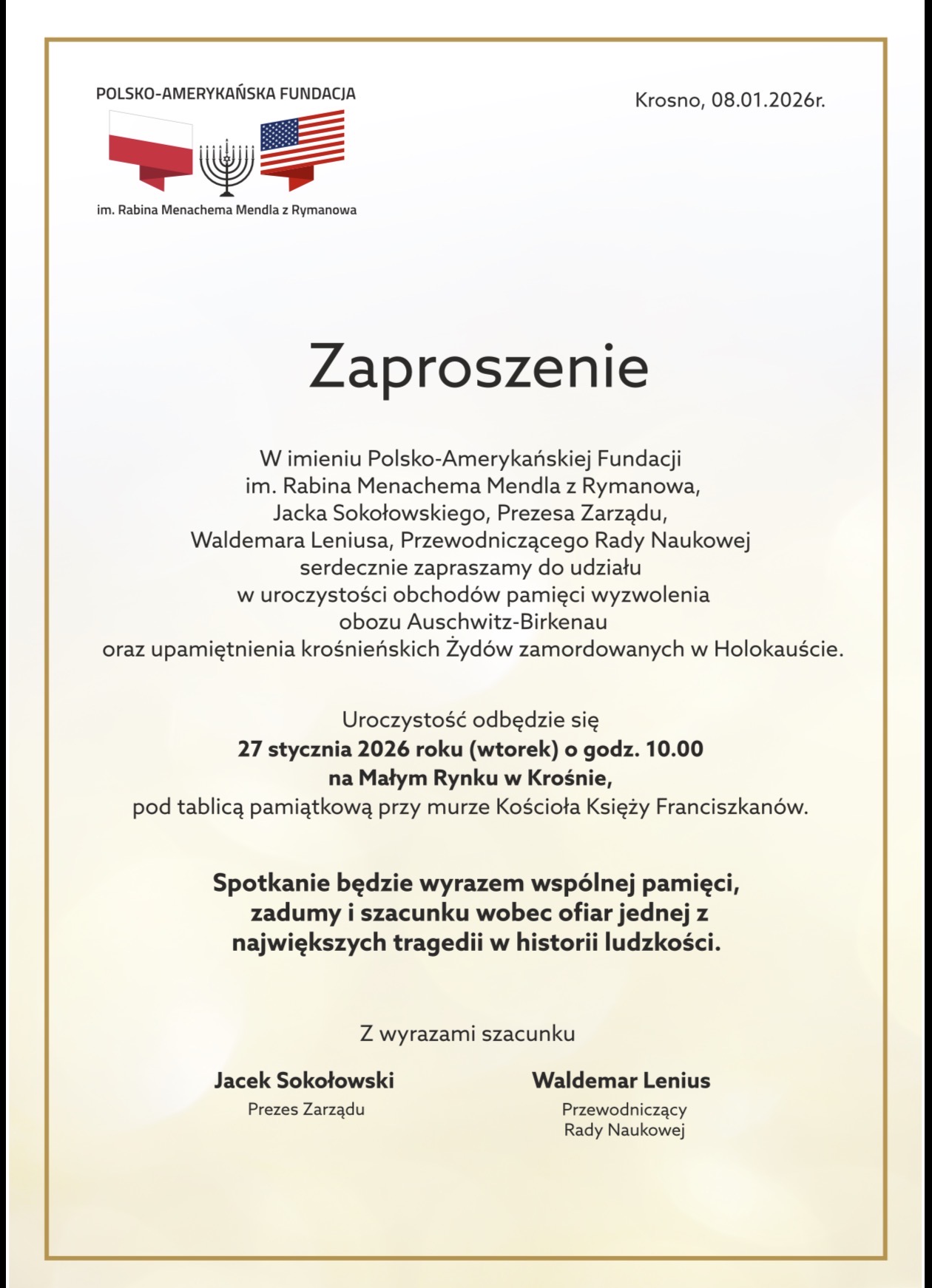 We wtorek, 27 stycznia, w Krośnie odbyły się drugie uroczystości związane z Międzynarodowym Dniem Pamięci o Ofiarach Zagłady. Wydarzenie zostało zorganizowane przez Polsko-Amerykańską Fundację imienia Rabina Menachema Mendla, przy współpracy z władzami miasta oraz lokalnymi instytucjami.